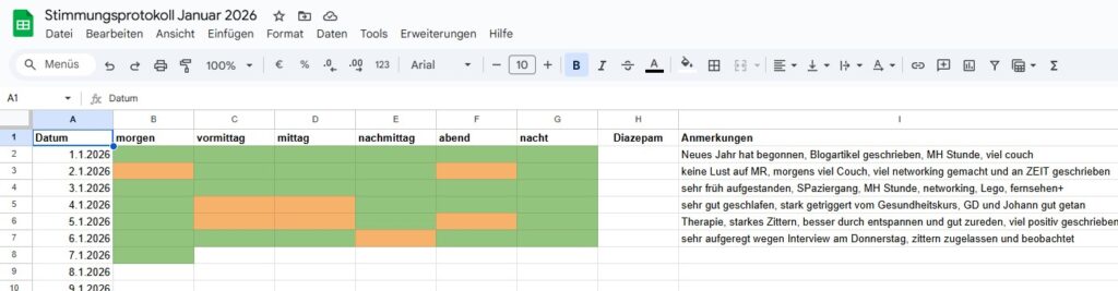 Hier ein Blick auf mein Stimmungsprotokoll (sieh auch Artikel Das Stimmungsprotokoll)